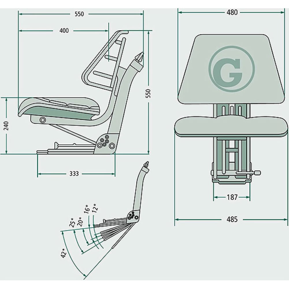 - Die Sitzkonsole ist mit einer fünffachen Neigungsverstellung ausgestattet 12°, 16°, 20°, 25°, 42°