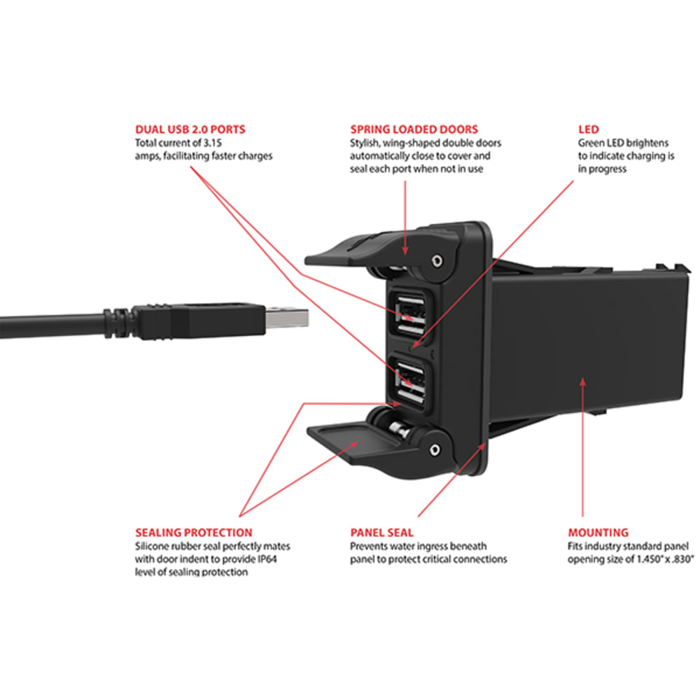 - Mit einem Gesamtstrom von 3,15 A bietet der V-Charger schnelles Laden selbst unter extremen Temperaturen von -40 °C bis 80 °C. Dieses innovative Produkt schützt seine Elektronik mit integriertem Überstrom- und Übertemperaturschutz sowie einem optionalen Lastabwurfschaltkreis zur Gewährleistung eines längeren sicheren und zuverlässigen Betriebs. Die mittlere LED zeigt den laufenden Ladevorgang an. Die Einrastmontage für branchenübliche Einbauöffnungen mit 1,450 Zoll x 0,830 Zoll erleichtert die Installation.