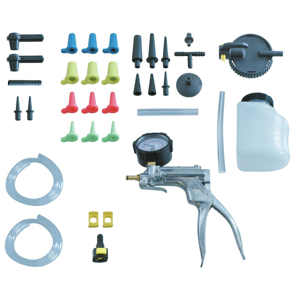 Zum schnellen und einfachen Überprüfen von Druck- und Unterdrucksystemen und zum Absaugen von Flüssigkeiten, wie Kraftstoff, Bremsflüssikkeit, etc. z.B. beim Entlüften der Bremse.
