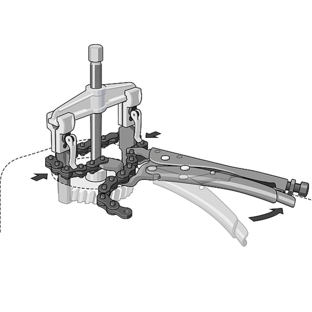 Mit No. 136 K-105 können die Haken verschiedener Abzieher nach dem Arretieren am abzuziehenden Bauteil mit der Kette umspannt und festgezogen werden. So können sich die Haken nicht mehr nach aussen biegen und abrutschen