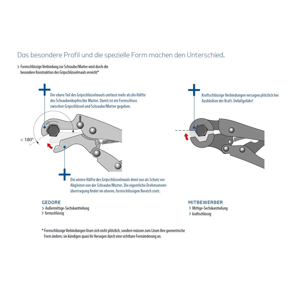 Formschlüssige Verbindung zur Schraube/Mutter wird durch die besondere Konstruktion des Gripschlüsselmauls erreicht.*