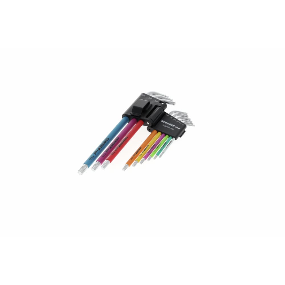 Farbcodierung mit Kunststoffbeschichtung für schnelleres Auffinden des passenden Winkelschlüssels, Runde Form, Lange Ausführung, Klappbarer Halter mit Gürtelclip