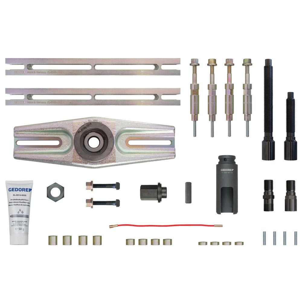 Besonders passend z.B. bei Mercedes (Bei V-Motoren muss aus Platzgründen gegebenenfalls der Motor abgesenkt werden); PSA (Nicht bei Euro 5 [8V] Motoren); Ford: 1.6 TDCi; VW-Audi: 2.0, 2.5, 2.7, 3.0 Common-Rail TDI; Volvo: 1.6 D, 2.2 D; Mazda: 16V (Nicht bei Euro 5 [8V] Motoren). - Stückliste (Text): 1x KL-0186-121 A - Abziehbrücke (Grundwerkzeug)