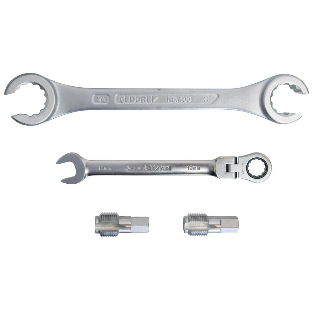 Durch die extrem kurzen Gewindebohrer und den speziellen Ringratscheschlüssel mit Gelenk, ist das Arbeiten auch unter stark beengten Platzverhältnissen problemlos möglich.