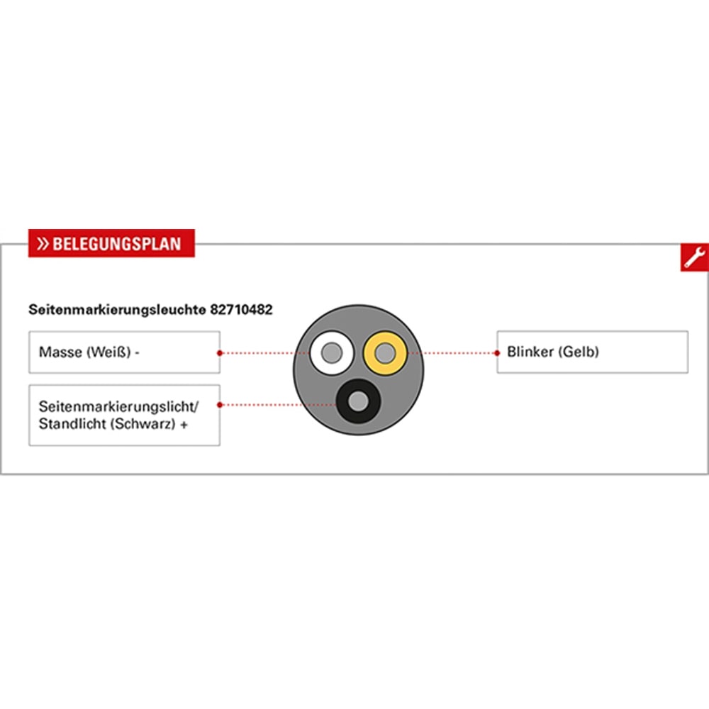 Die Seitenmarkierungsleuchte entspricht den Anforderungen der ECE R48 §6, einen Abbiegevorgang eines Fahrzeugs der Klasse M1 oder N1 durch eine blinkende Seitenmarkierungsleuchte einzuleiten. Das Blinken entspricht dabei der Blinkfrequenz des Fahrtrichtungsanzeigers auf der jeweiligen Seite. Zusätzlich zu diesem sicherheitsrelevanten Vorteil ist die Leuchte einfach zu montieren: Die Leuchte kann direkt ohne Halterung montiert oder mit einem 90 °- Winkelhalter nach innen oder nach aussen beliebig am Fahrzeug positioniert werden.