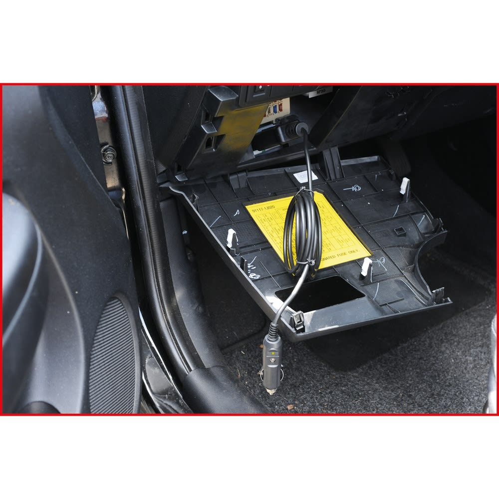 - Anschluss erfolgt über die OBD II-Buchse und Zigarettenanzünder-Anschluss einer akkubetriebenen Starthilfe