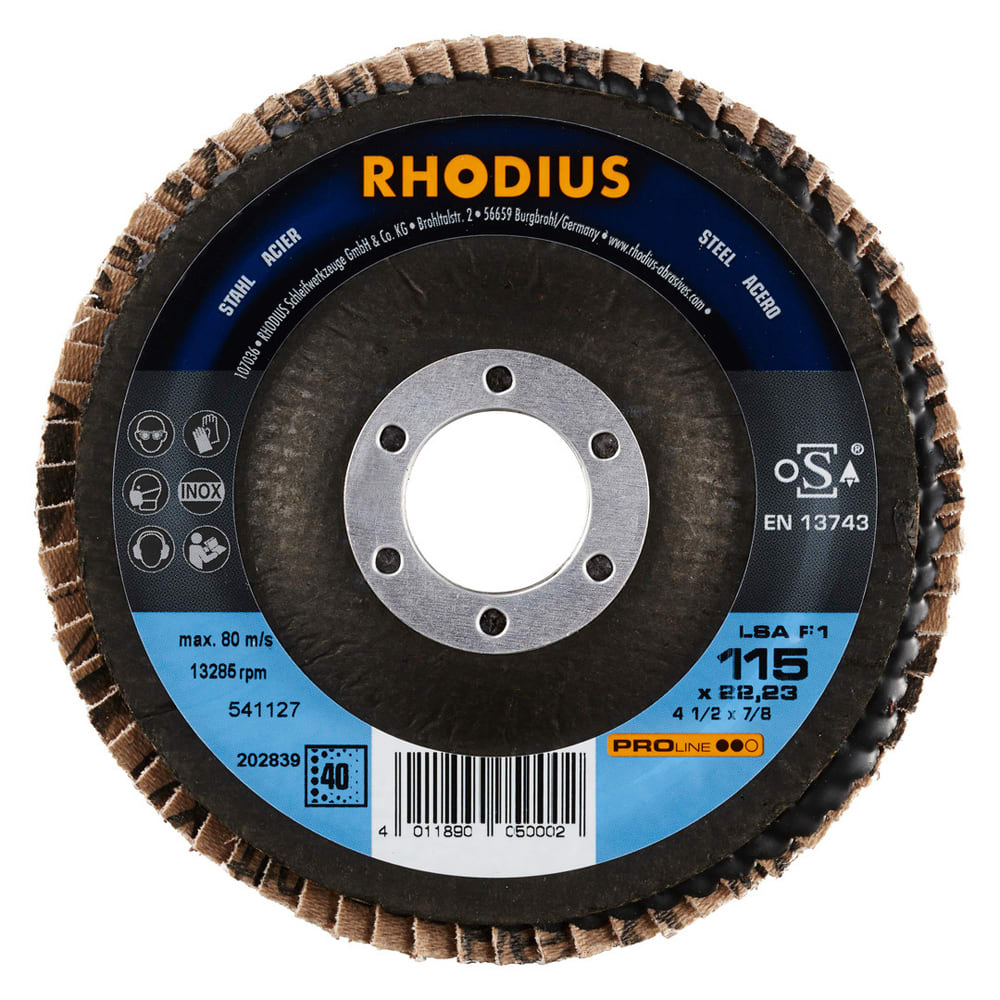 RHODIUS Fächerschleifscheibe LSA F1 wurde gezielt für die Bearbeitung von Edelstahl (z.B. V2A, 1.4301), Stahl (Schwarzstahl auch Baustahl, St37, S235JR, 1.0037 oder Karbonstahl genannt) und Stahlguss entwickelt.