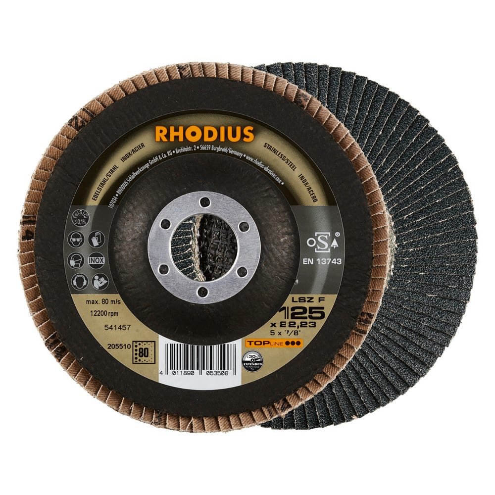 Die RHODIUS Fächerschleifscheibe LSZ F EXTENDED wurde gezielt für die Bearbeitung von Edelstahl (z.B. V2A, 1.4301), Stahl (Schwarzstahl auch Baustahl, St37, S235JR, 1.0037 oder Karbonstahl genannt) und Stahlguss entwickelt. Die Scheibe punktet hier mit einer sehr hohen Standzeit bei fortwährend aggressivem Abtrag.