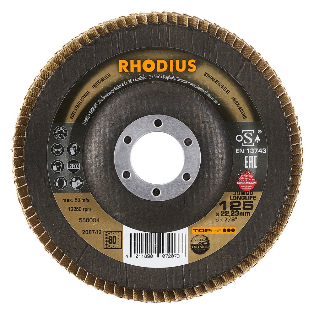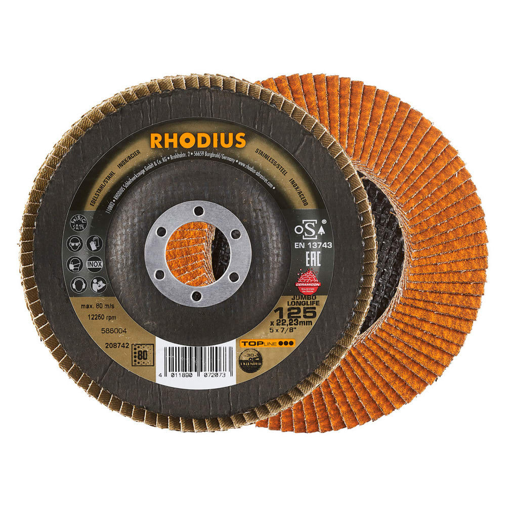 Bei der JUMBO LONGLIFE EXTENDED wird als Schleifkorn ein hochwertiges Keramikkorn (Sinterkorund) mit Zirkonkorn eingesetzt. Alle RHODIUS-Lamellenscheiben sind zudem eisen- und schwefelfrei.