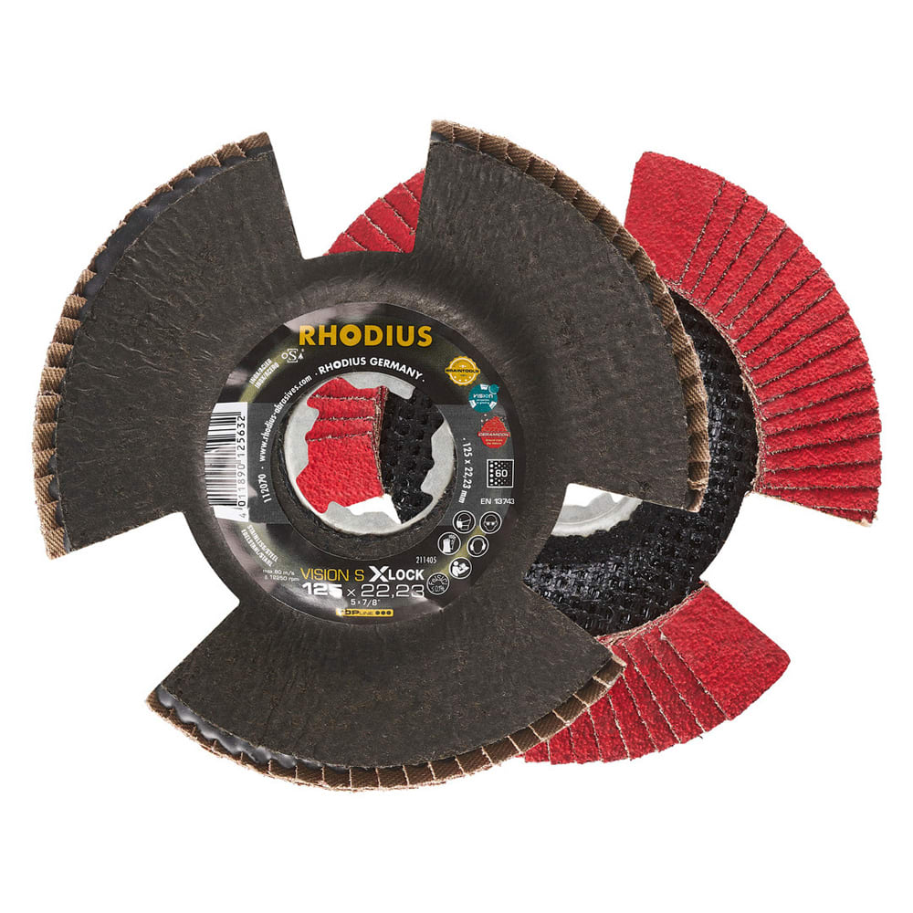 Bei der VISION SPEED X-LOCK wird als Schleifkorn ein hochwertiges Keramikkorn (Sinterkorund) verwendet. Dieses ist selbstschärfend. Alle RHODIUS-Lamellenscheiben sind zudem eisen- und schwefelfrei.