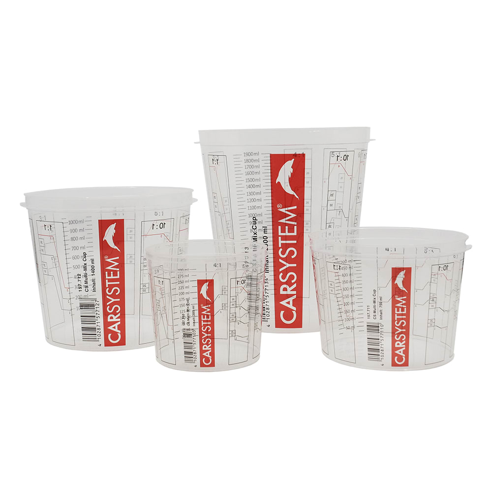 Die Carsystem Multi Mix Cup 2.0 sind Einweg - Mischbecher mit separat erhältlichen Deckeln und aufgedruckten Mischungsskalen zum sauberen und exakten Anmischen aller Lackmaterialien.