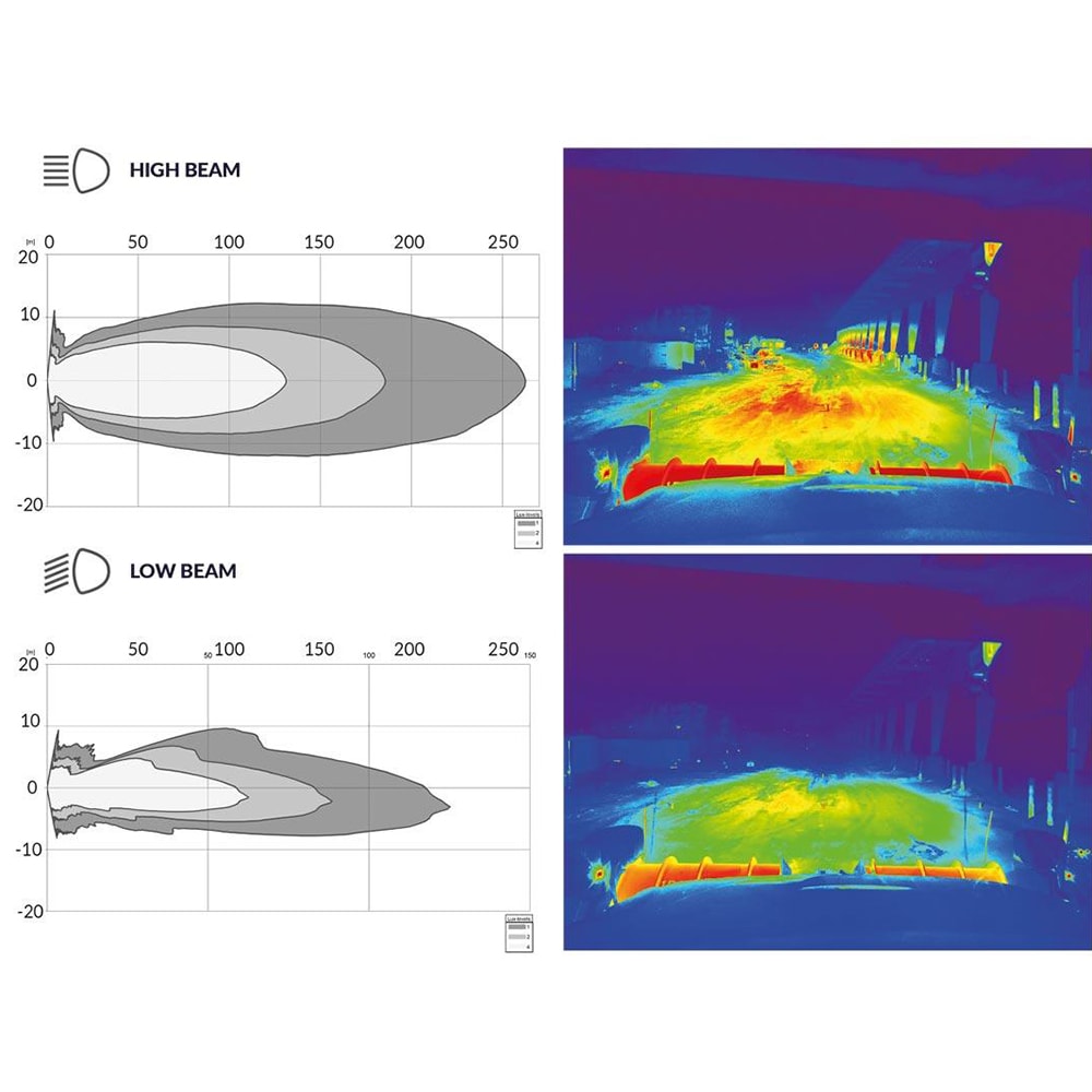 Verbrauch: Bei 24 Volt: Abblendlicht 30 W / Abblendlicht + Enteisung 50 W / Fernlicht 60 W / Fernlicht + Enteisung 80 W / Blinker 16 W / Position 5 W / DRL 16 W.