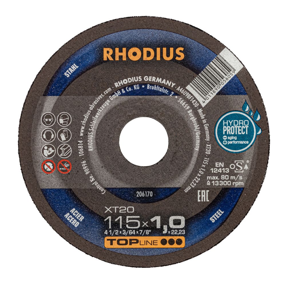 Es handelt sich hier um eine Scheibe in gerader Form (Form 41). Trennscheiben mit gerader Form ermöglichen eine grössere Eintauchtiefe und somit auch mehr Schnitte. Die RHODIUS XT20 Scheiben in den Durchmessern 180 mm und 230 mm profitieren zudem von der hier eingesetzten RHODIUS EXTENDED Technologie für noch mehr Lebensdauer.
