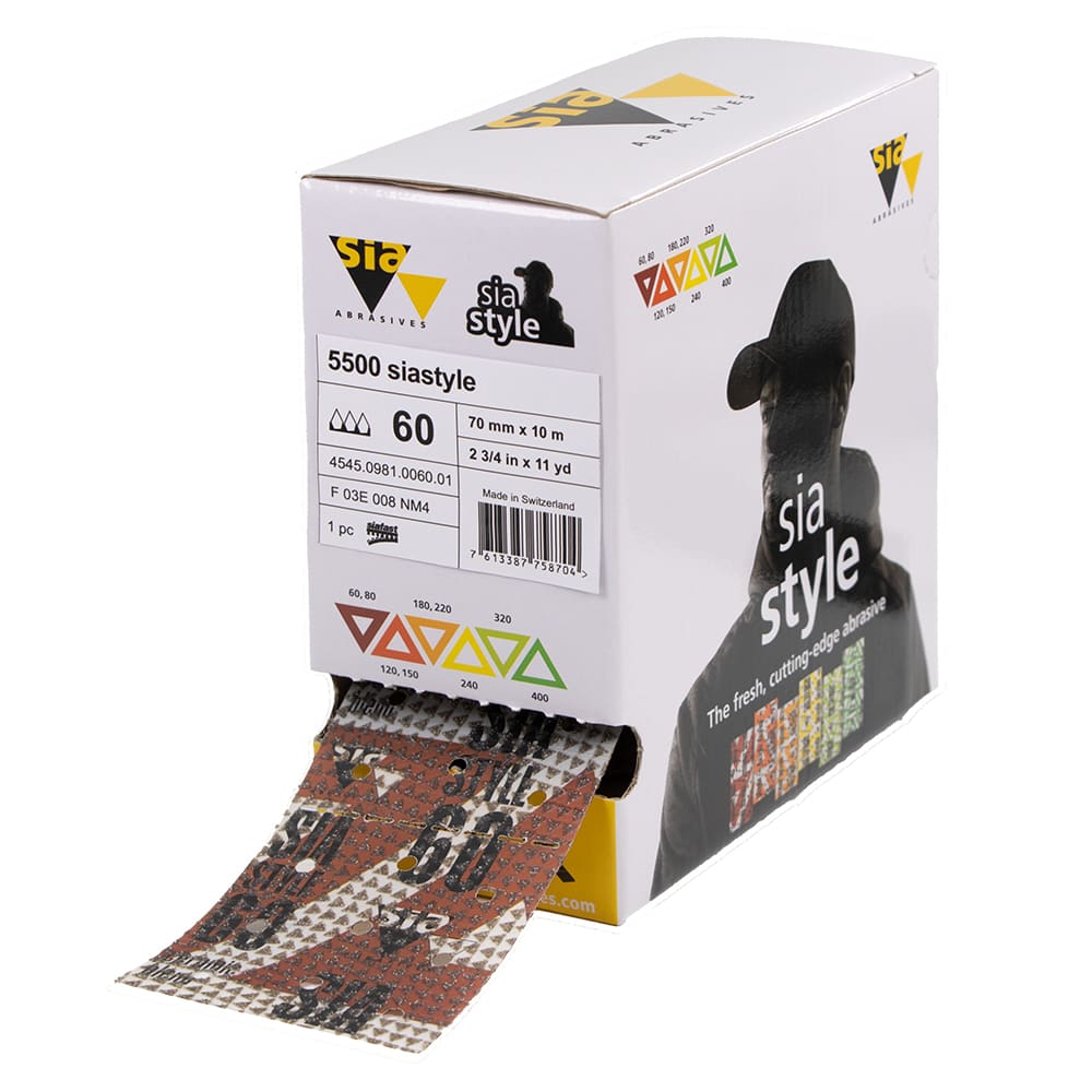 Das neue, farbcodierte Schleifmittel 5500 siastyle überzeugt mit absoluter Prozesssicherheit und frischem Design. Die stabilen Korninseln garantieren höchste Produktivität und einen konstanten Arbeitsprozess. Die robuste Folienunterlage hat eine hohe Reissfestigkeit und hält stärksten Beanspruchungen stand. Für uns, das coolste Schleifmittel.