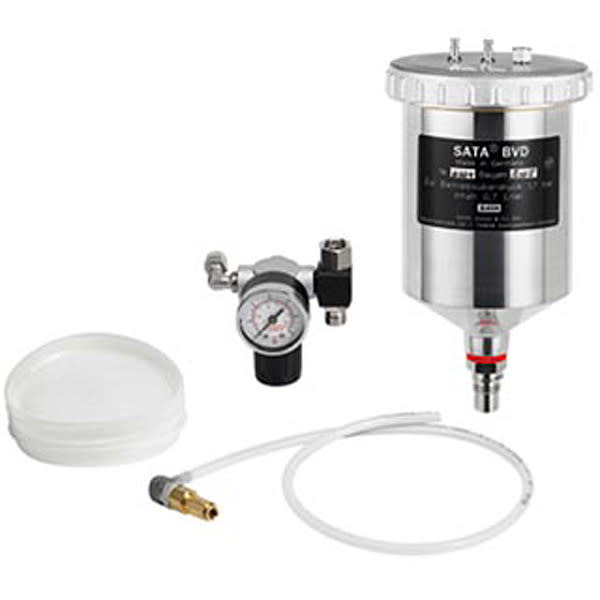 Für SATAjet 4000, jet 1000, jet 3000, jet 2000 HVLP, jet RP, LM 2000- Nachrüstsatz komplett mit 0,75 l Druckbecher, Luftmikrometer/Manometer und Zuführungsschlauch- ideal zur nebelarmen, spritztechnischen Verarbeitung hochviskoser Materialien- keine Veränderung der Viskosität notwendig- individuelle Materialdruckeinstellung- QCC-Anschluss und Aussengewinde M 16 x 1,5