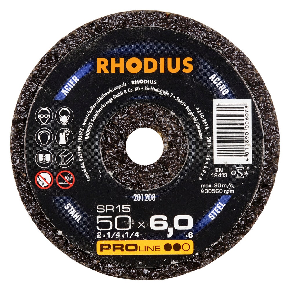 Das Schleifrad wird nach EN 12413 hergestellt und sicherheitsgeprüft und ist oSa-zertifiziert. Es enthält hochwertiges Schleifkorn (Aluminiumoxid auch Korund genannt) und speziell abgestimmtes Phenolharz sowie eine Armierung aus drei vollflächigen Glasfaser-Gewebelagen. Dieses Schleifrad übertrifft so bei Weitem die gesetzlich geforderte Seitenlast von 290 N.