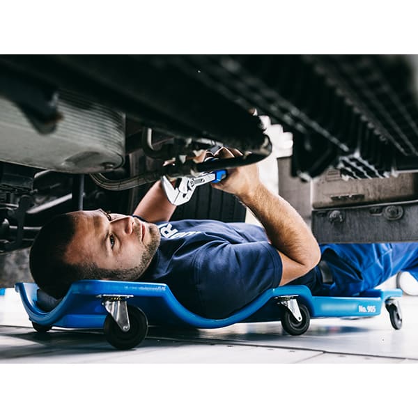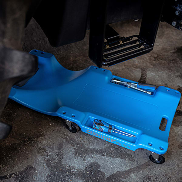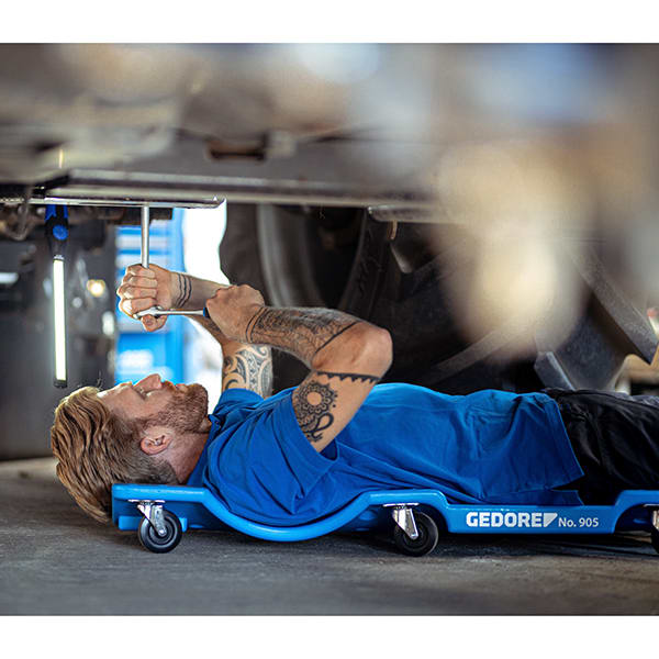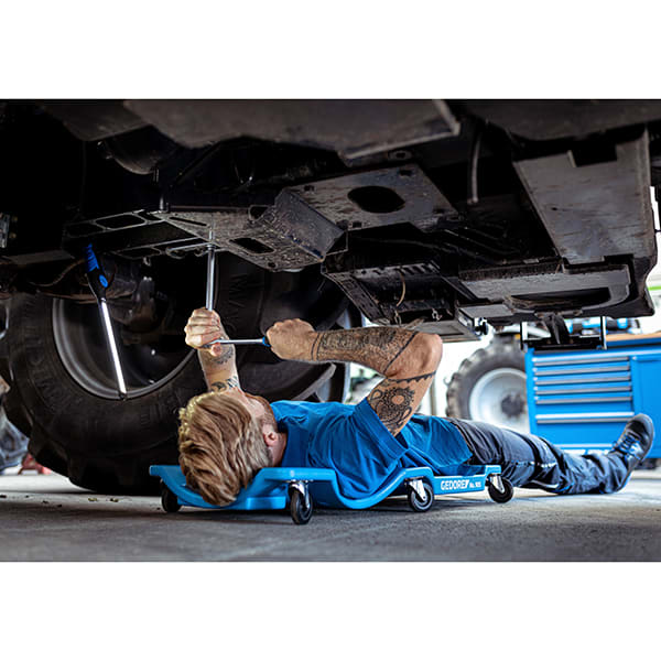 - Durch die 6 kugelgelagerten 360° Rollen und die geringe Aufbauhöhe kann man sich mit der Werkstattliege sehr gut in enge und schlecht zugängliche Arbeitsbereiche rollen