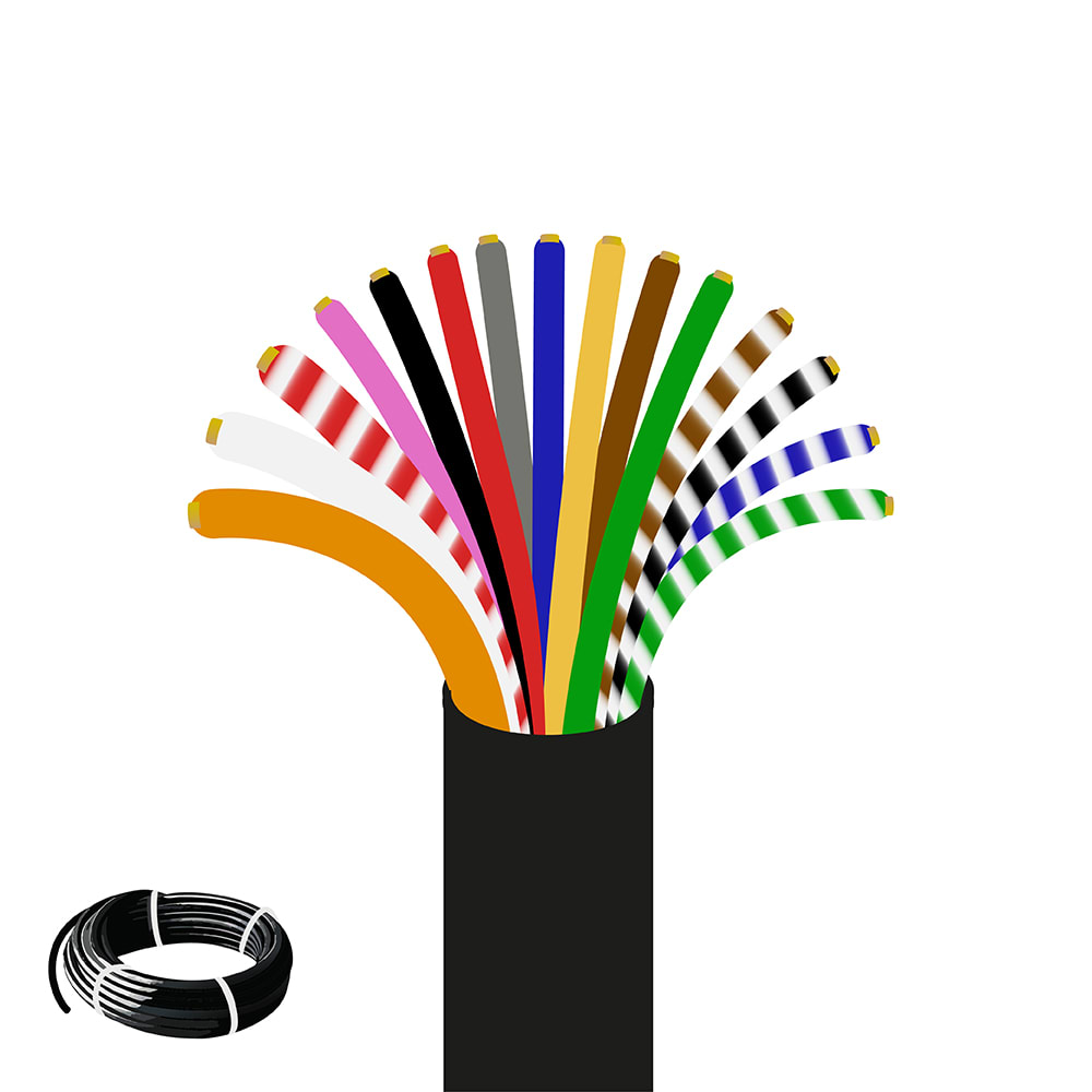 - 15-Adrig = 12+3-Adrig = 12 x 1.5mm² = schwarz, rot, grau, blau, gelb, braun, grün, rosa, ws/sz, ws/bl, ws/gn, ws/bn / 3 x 2.5mm² = weiss, ws/rt, orange