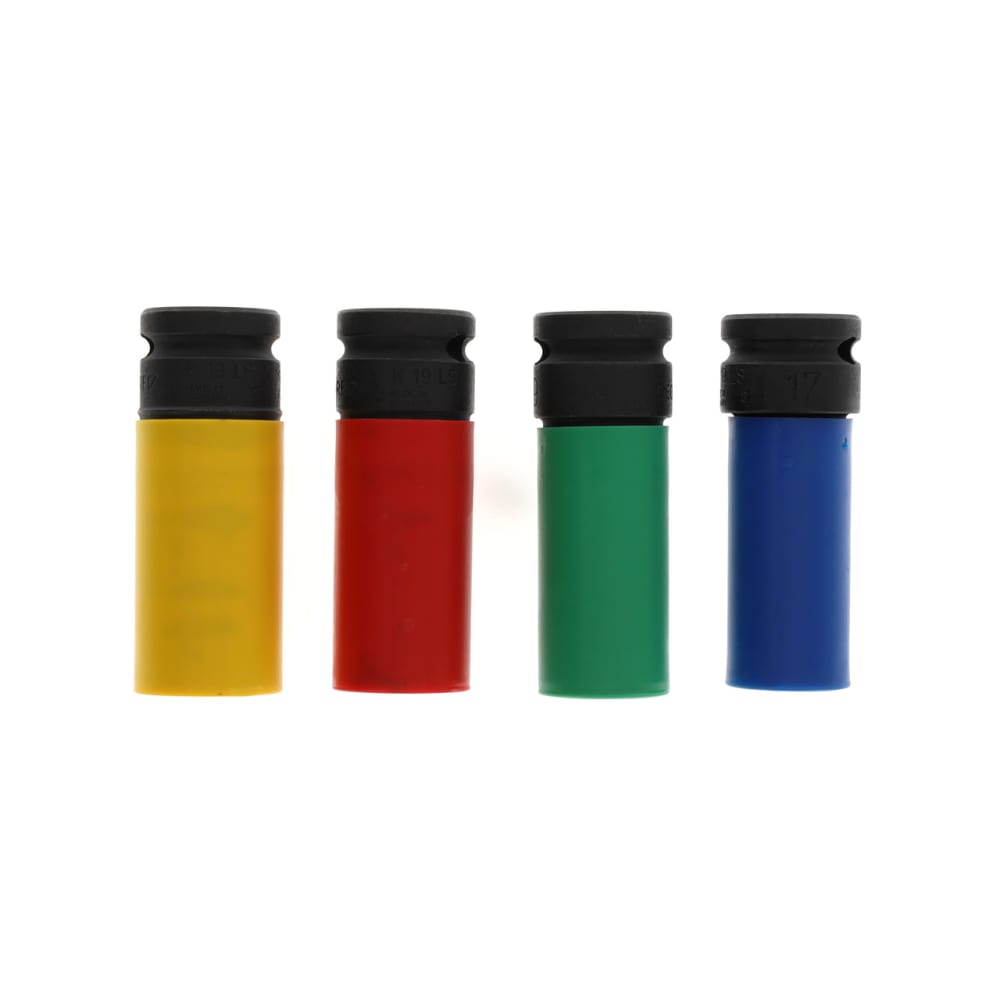4 Kraftschraubereinsätze mit Schutzhülse, 6-kant, lange Form, Maschinenbetätigt, passend für alle gängigen Druckluft- und Elektroschrauber, Mit Innenvierkantantrieb nach DIN 3121 - G 12,5, ISO 1174, Dünnwandiger zum Schutz der Leichtmetall-Felgen