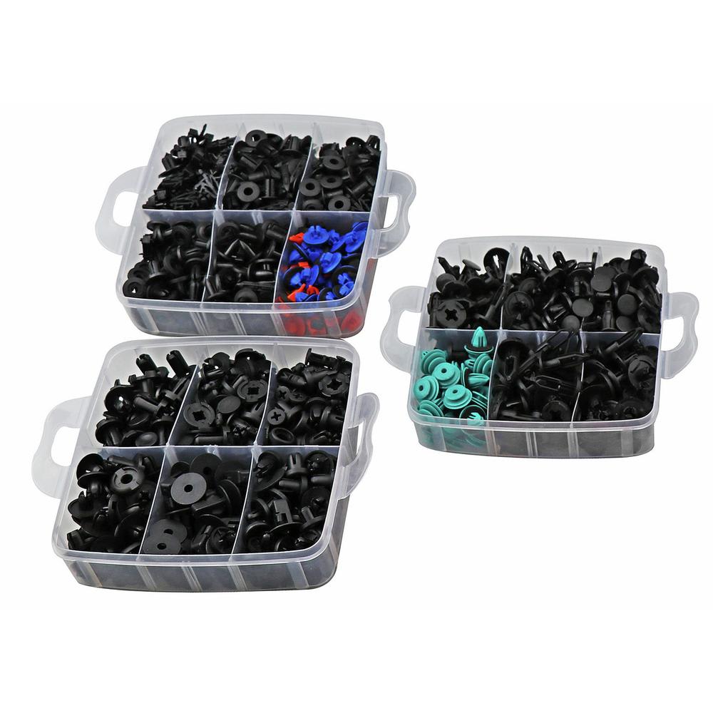 Das Set enthält eine grosse Auswahl an gängigen Befestigungsclips und Spreiznieten, übersichtlich aufbewahrt in einem praktischen Stapelboxsystem.