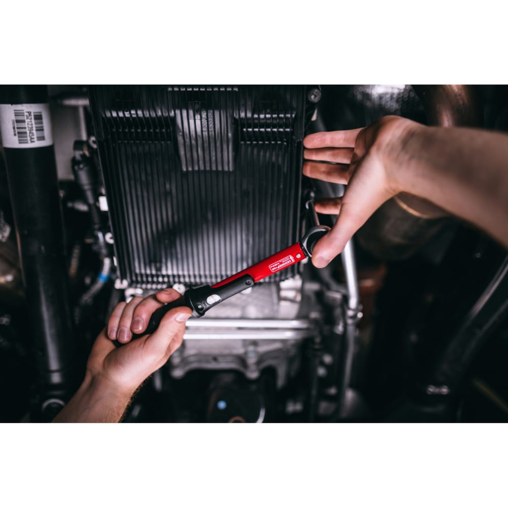 Verstellbarer Drehmomentschlüssel mit Vierkantantrieb und integrierter Knarrenfunktion, Deutlich hör- und fühlbare Drehmomentauslösung, Rechtsanzug und Linksanzug durch Umstecken des Pilzkopfs / Durchsteckvierkants, Auslösegenauigkeit: +/-3 % Toleranz vom eingestellten Skalenwert