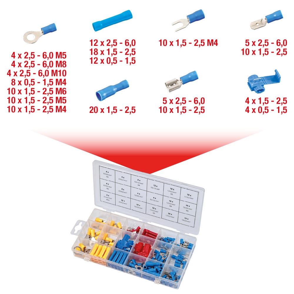 - Geeignet für Kabelquerschnitte: rot 0,5-1,5 mm², blau 1,5-2,5 mm², gelb 2,5-6,0 mm²