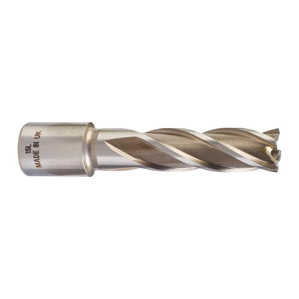 - Längere Standzeit: die Schneiden des Kernlochbohrers müssen seltener geschärft werden als die Schneiden eines Spiralbohrers. Der 6 mm starke Bohrkörper sowie die optimierte Schneidengeometrie gewährleisten eine hohe Standfestigkeit