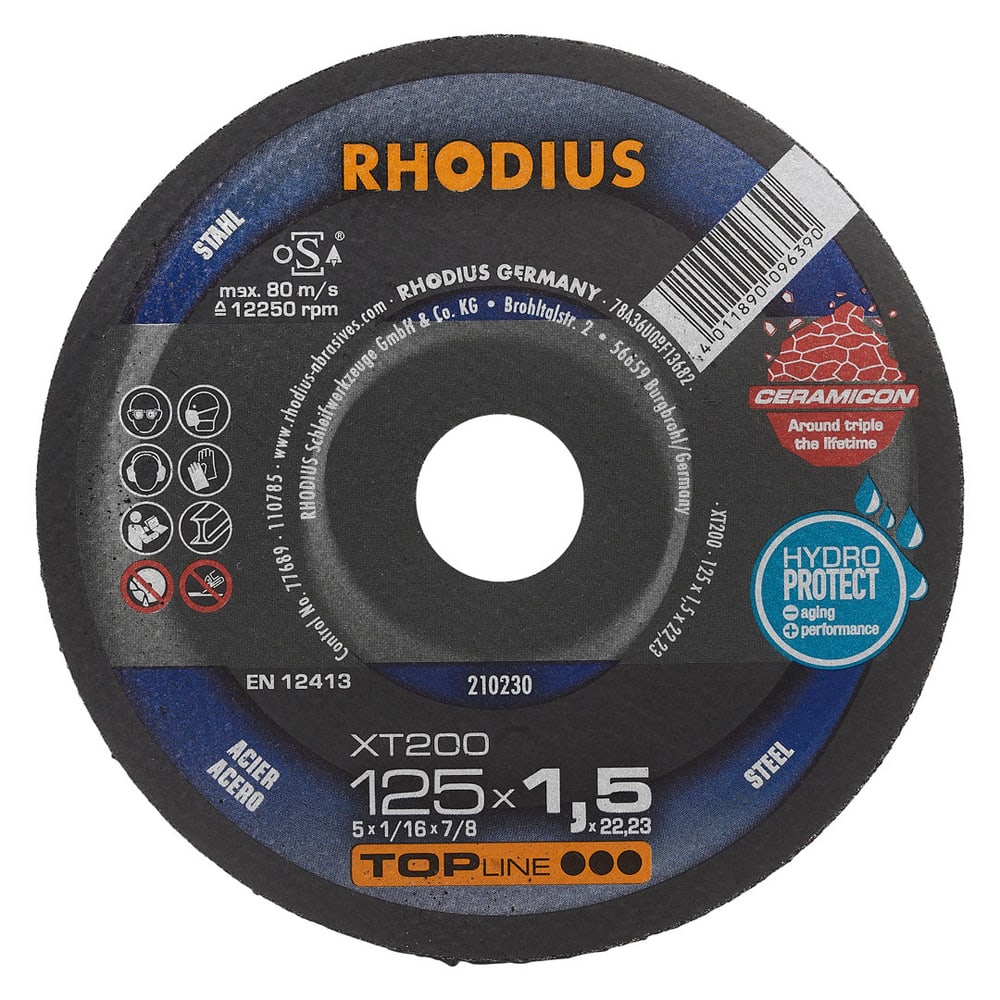 Die Trennscheibe enthält hochwertiges Sinterkorund und 2 vollflächige Glasfasergewebe. Die Mindestseitenlast für die Trennscheibe beträgt nach EN 12413 und oSa 40 N, bzw. ab Durchmesser 150 mm 50 N. Im Bohrungsring ist das Verfallsdatum (drei Jahre) eingeprägt. Durch aufwendige In-Prozess-Kontrollen in der Produktion wird eine gleichbleibende Qualität gewährleistet. Um ein Maximum an Sicherheit zu bieten, wird jede tausendste Scheibe zerstörend getestet.