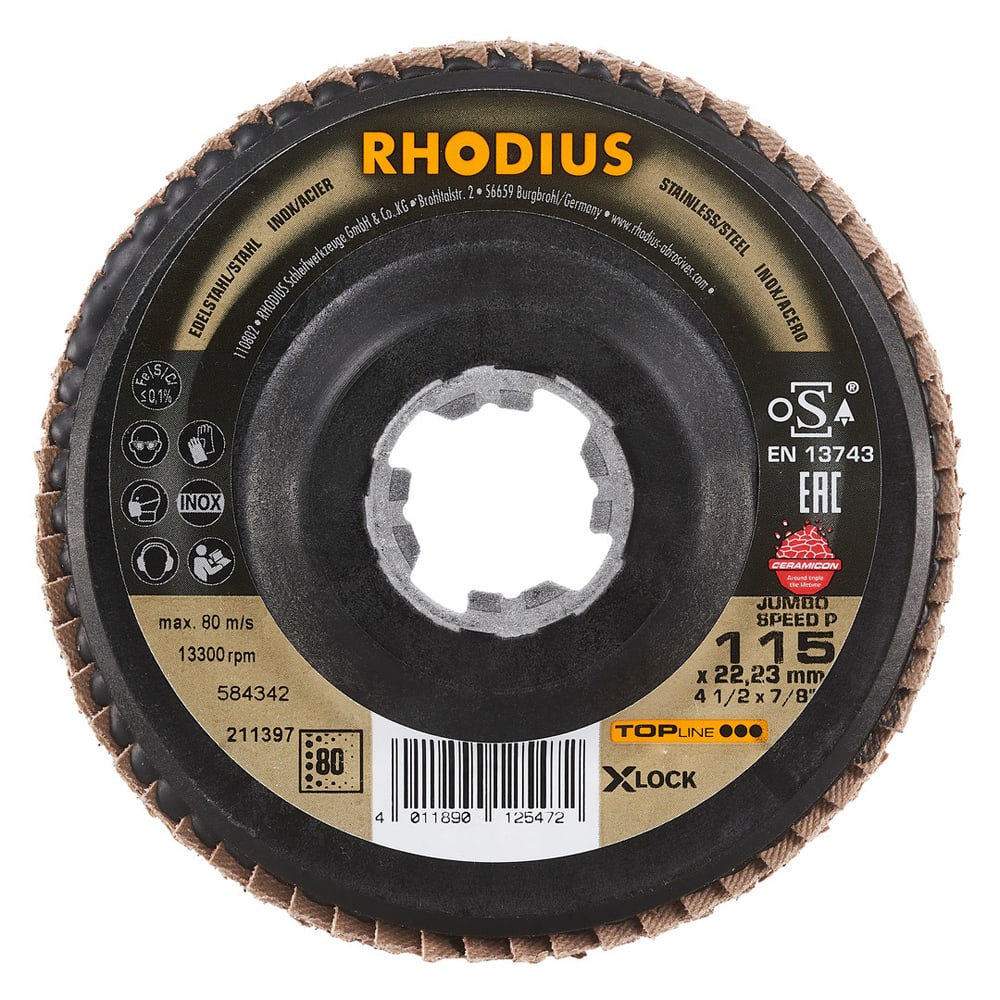 Bei der JUMBO SPEED P X-LOCK wird als Schleifkorn ein hochwertiges Keramikkorn (Sinterkorund) verwendet. Dieses ist selbstschärfend. Alle RHODIUS-Lamellenscheiben sind zudem eisen- und schwefelfrei.