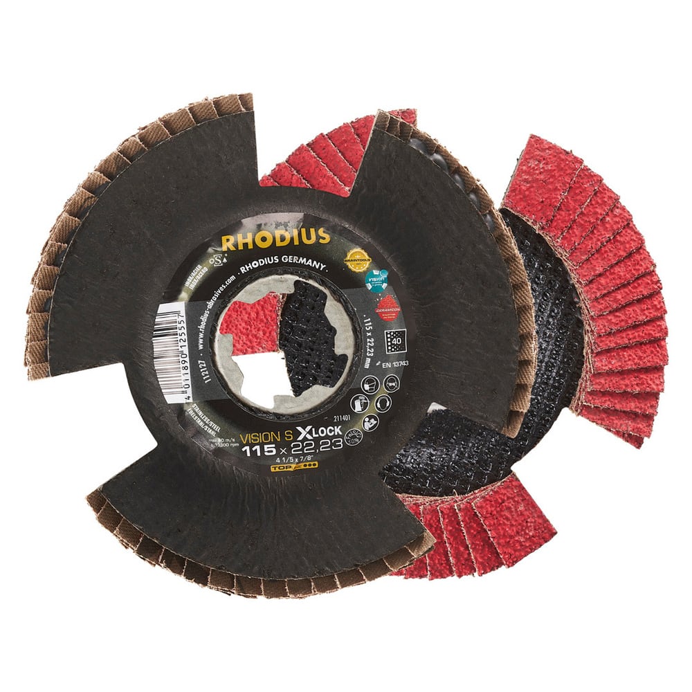 Bei der VISION SPEED X-LOCK wird als Schleifkorn ein hochwertiges Keramikkorn (Sinterkorund) verwendet. Dieses ist selbstschärfend. Alle RHODIUS-Lamellenscheiben sind zudem eisen- und schwefelfrei.
