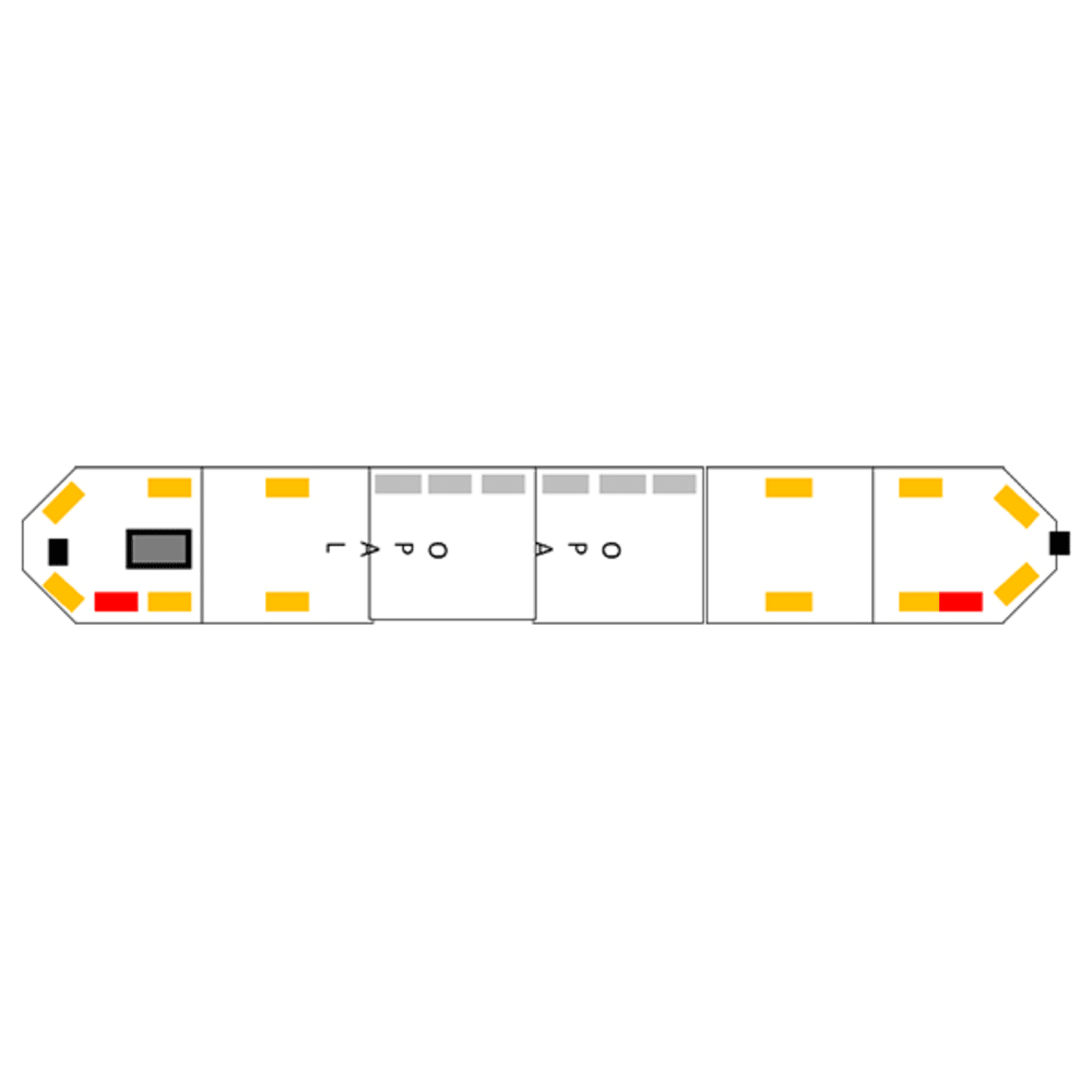 | Zusatzbestückung | 2x Schluss-/Bremslicht/Blinker, 2x Seitenscheinwerfer, Zentralbeleuchtung, undurchsichtig für Schriftzüge |