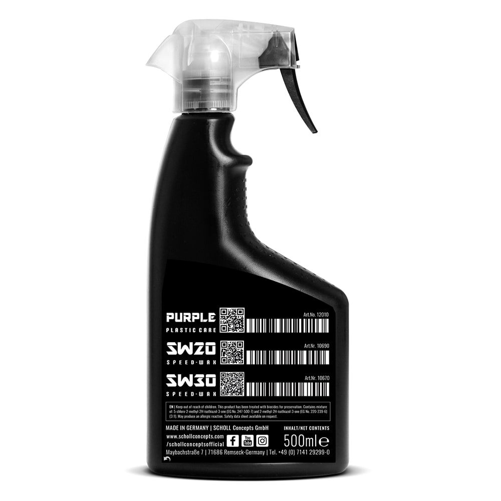 ANWENDUNG | PURPLE aufsprühen und mit dem handlichen schwarzen Applikations-Puck oder NEO SpiderPuck kreisförmig verteilen, kurz antrocknen lassen - fertig! Die behandelten Flächen erhalten so einen sehr natürlichen und seidenmatten Glanz. Fettige, rutschige und kitschig glänzende Innenräume gehören dank PURPLE der Vergangenheit an. Starke Verschmutzungen im Innenraum sollten vor der Behandlung mit dem Universalreiniger SPAM bzw. dem Fleckenentferner PREPERATOR und dem lila SCHOLL Spider-Reinigungspuck gereinigt werden.