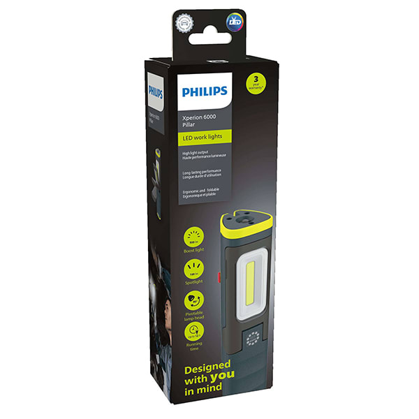Die Philips Xperion 6000 Pillar hält den ganzen Tag mit einer einzigen Ladung. Die helle Hauptbeleuchtung mit 250 und 500 lm und das integrierte 180 lm Spotlicht erfüllen zahlreiche Anforderungen. Faltbar für einfaches Tragen und einstellbare Lichtwinkel.