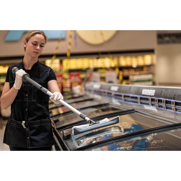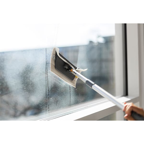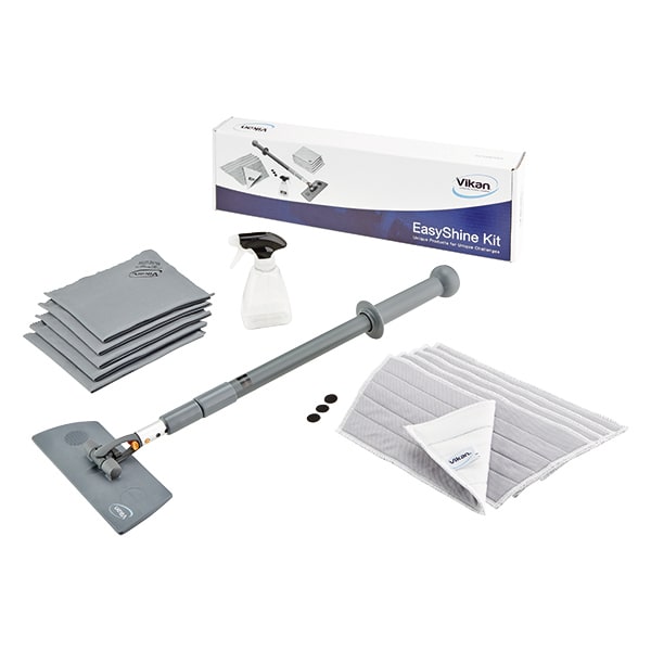 Das Easyshine Kit von Vikan mit flexiblem Mopphalter ist eine Komplettlösung für die Reinigung von Fenstern, Spiegeln, Fliesen, Whiteboards sowie Edelstahl- und anderen Hochglanzoberflächen, einschließlich gebogener Oberflächen wie Drehtüren, Badewannen, Whirlpools, Fahrzeugscheiben und Plastikschalensitzen. Das Kit umfasst 5 Fenster-Mopps, 5 Poliertücher, 1 Sprühflasche, 1 flexiblen Mopphalter und 1 Teleskopstiel.