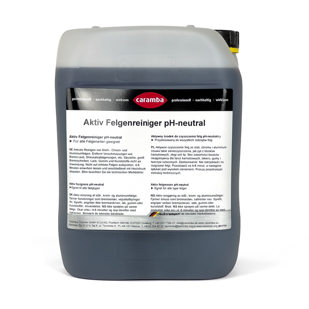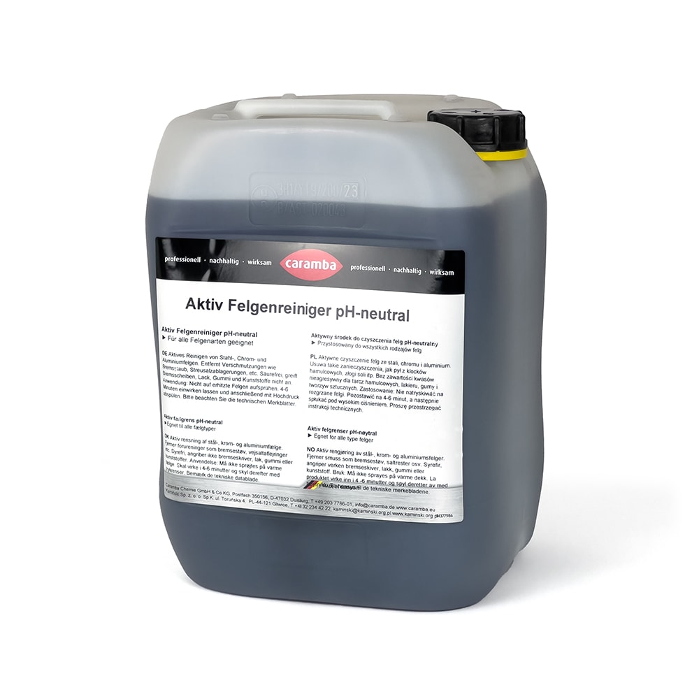 Bidon: Secouer le bidon avant utilisation ou transvasement du produit! Le nettoyant actif pour jantes Caramba peut être appliqué avec un pulvérisateur à pompe ou une brosse douce. Mouiller soigneusement les zones sales. Laisser agir et attendre la coloration rouge. Celle-ci commence déjà après peu de temps selon le degré de salissure. Après 8-10 minutes, rincer les jantes abondamment avec un jet d'eau puissant, par exemple un appareil haute pression.