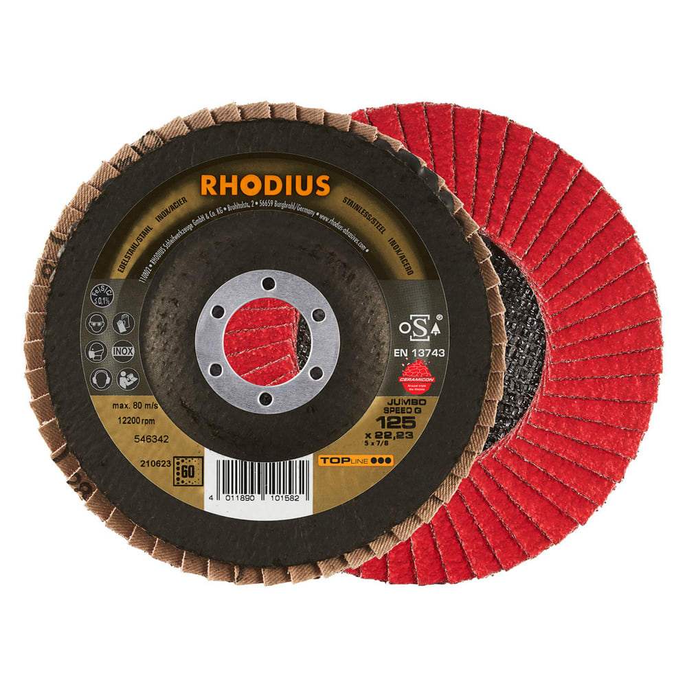 Ce disque a été conçu conformément à la norme EN 13743, satisfait aux exigences de sécurité et est homologué par l’oSA. Il est doté d’un plateau support en fibres de verre. Son utilisateur peut travailler en exerçant de fortes pressions sur sa machine. Le JUMBO SPEED G utilise un grain céramique de qualité (corindon fritté) comme grain abrasif. Celui-ci est auto-affûtant. Tous les disques à lamelles RHODIUS ne contiennent en outre ni fer, ni soufre. Les lamelles de ce disque sont plates. Lorsqu'un meulage plan est requis, l’agencement plat des lamelles facilite tout particulièrement le travail.