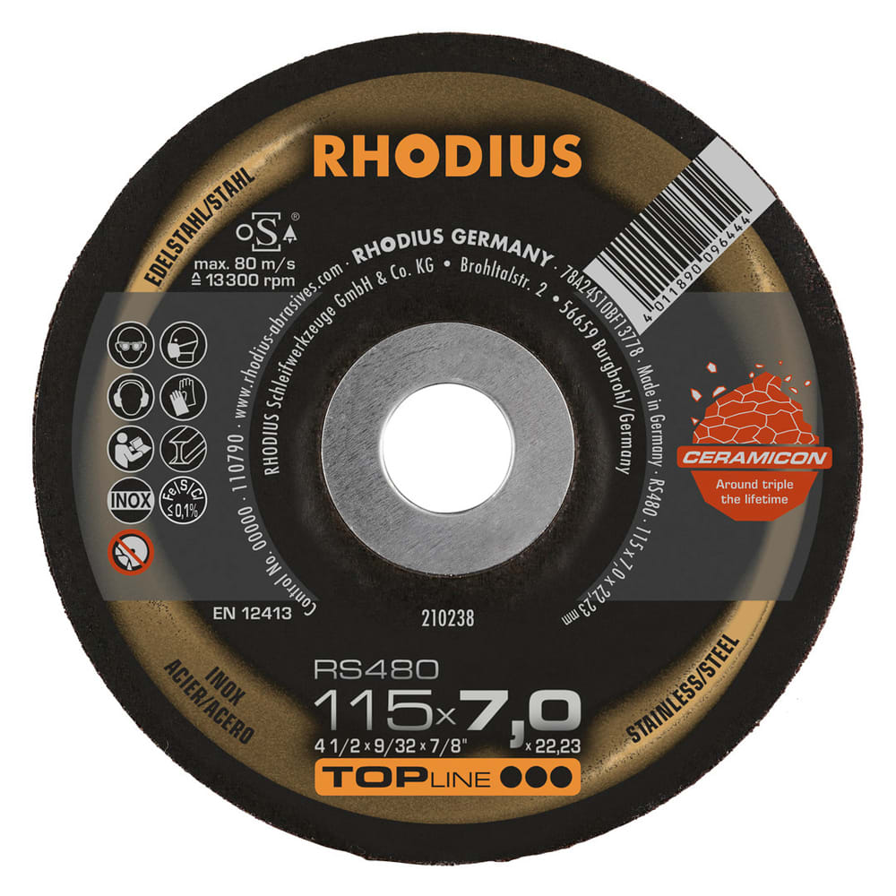 La RHODIUS RS480 a été spécialement conçue pour le traitement de l'acier inoxydable (acier VA, inox), tel que le 1.4301 (X5CrNi18-10 ou 304), de l'acier (acier au carbone, également appelé acier de construction, St37, S235JR, 1.0037 ou acier noir) et de la fonte d'acier. La meule à ébarber RS480 convient parfaitement pour le chanfreinage, la préparation et l'égalisation des cordons de soudure, mais aussi pour le nettoyage et l'égalisation des pièces en fonte, ainsi que pour le cassage des arêtes et l'ébavurage.